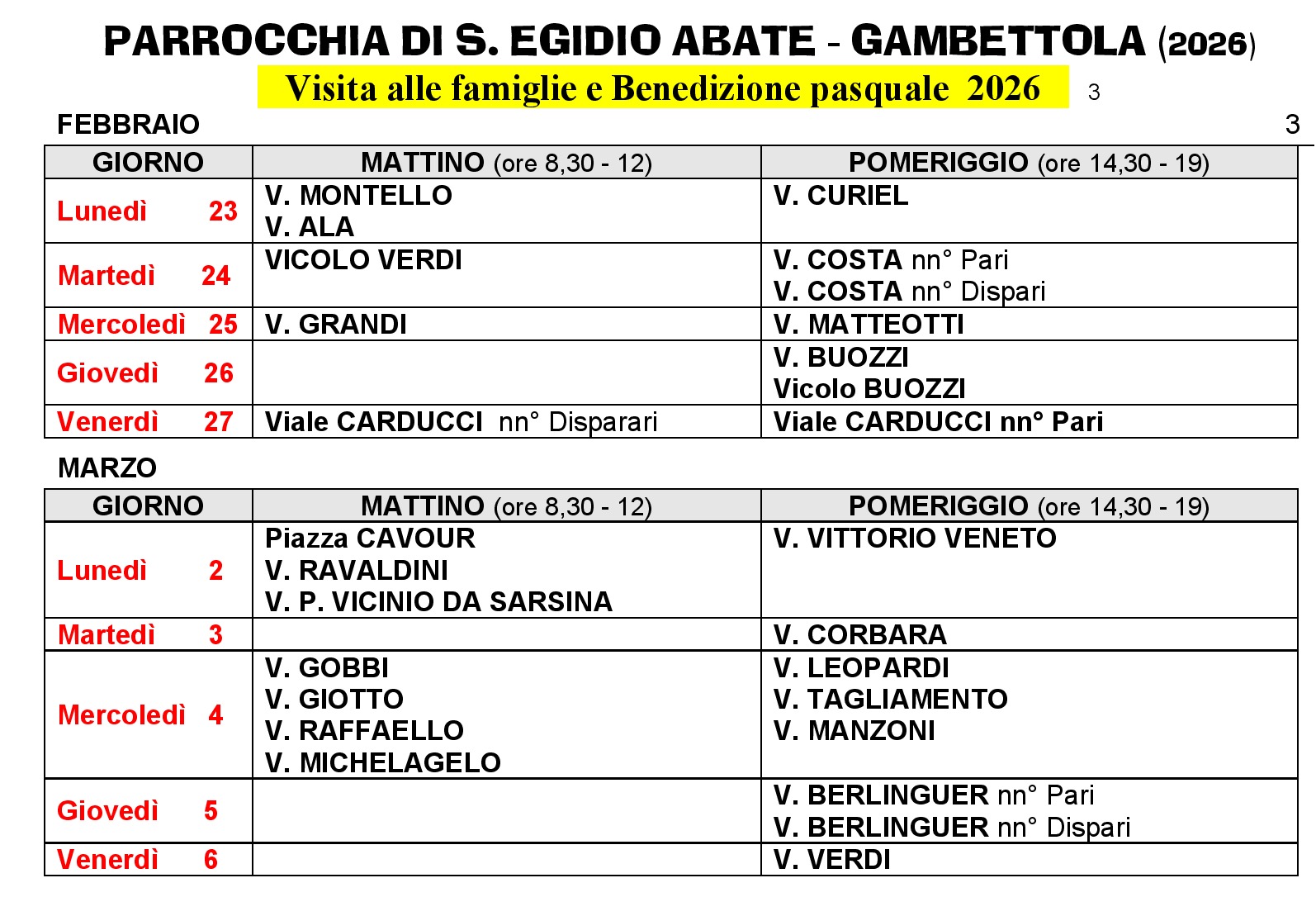 Sono iniziate le benedizione alle famiglie clicca qui sotto per il calendario delle vie: